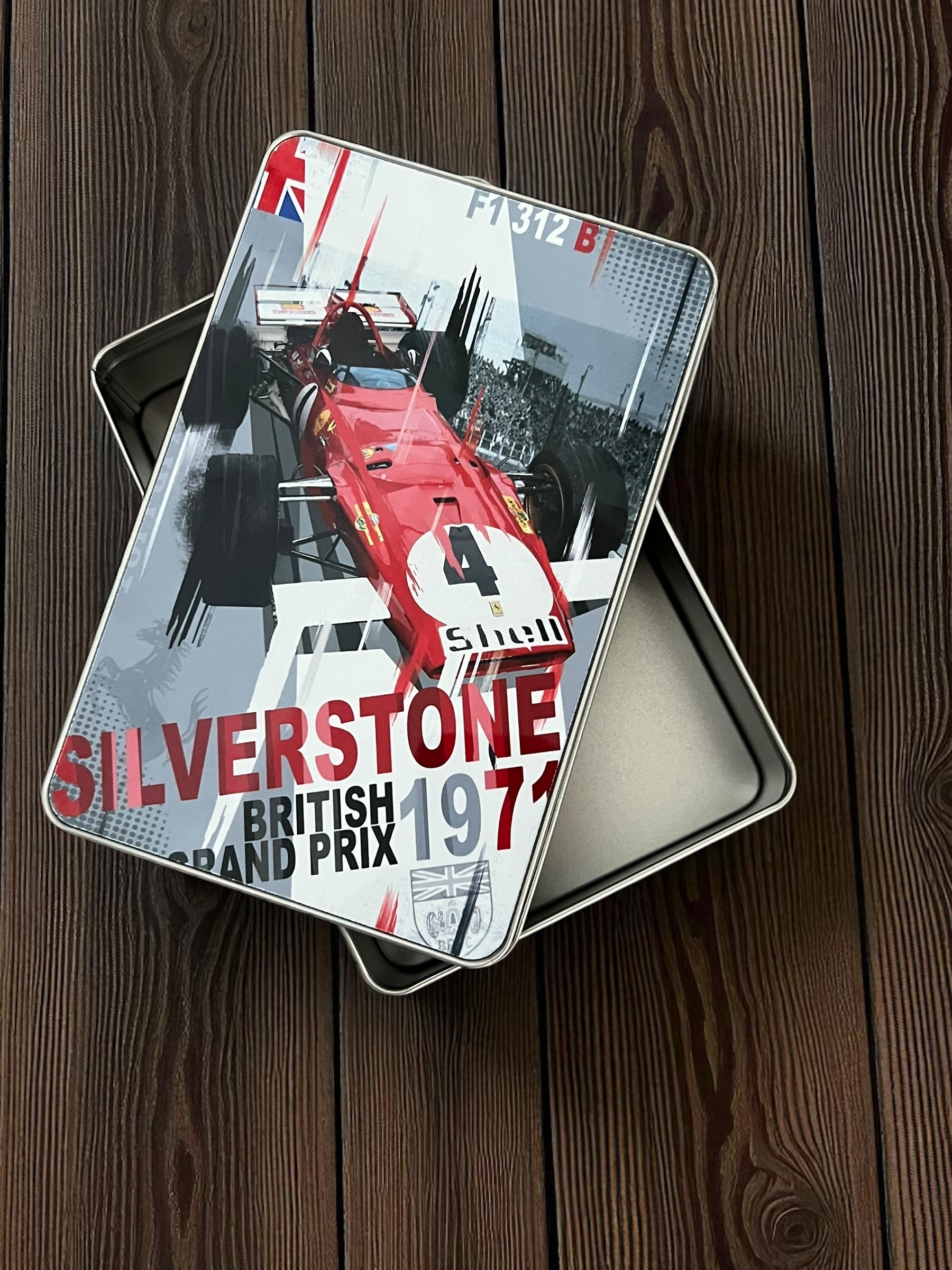 Store your classic's keys and other essential paraphernalia in this beautiful metal box. What makes this storage box special is its fully removable lid that features an evocative pop art rendition of Jackie Ickx's Ferrari 312B en route to an unexpected and humbling retirement at the 1971 British GP. Despite Ferrari's famous flat-12 312B enjoying a power advantage at the high speed Silverstone circuit, both Ferraris faded through the race with severe tyre degradation. Ickx retired with a disintegrating front tyre while Regazzoni's oil pressure disappeared during an unscheduled tyre change.
